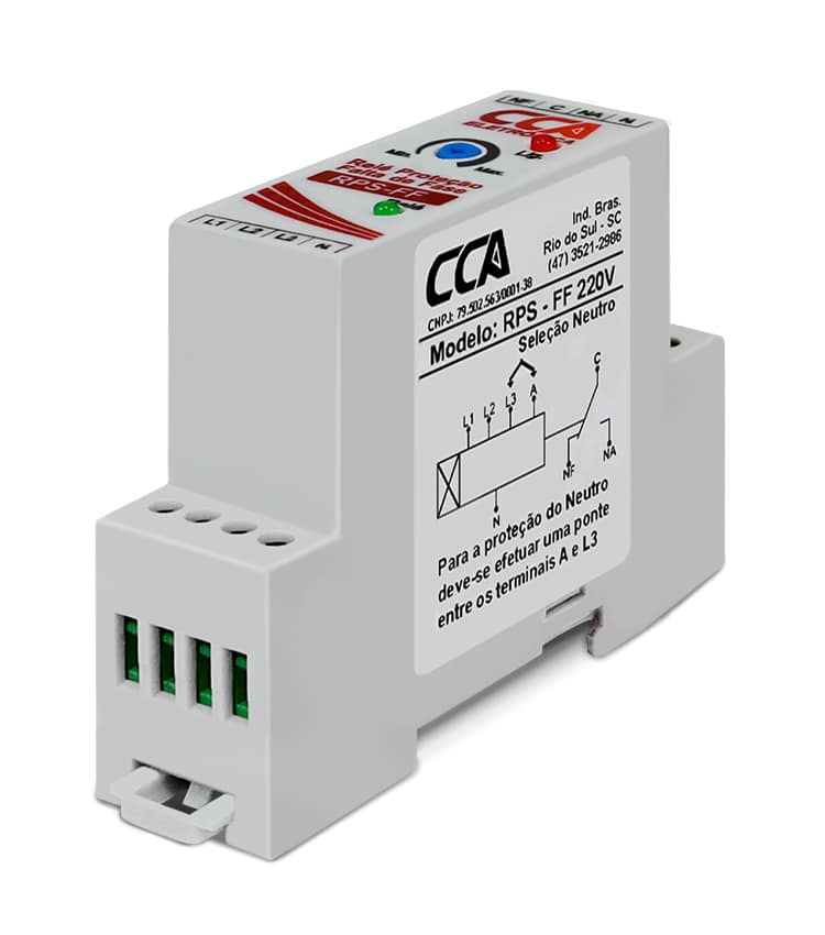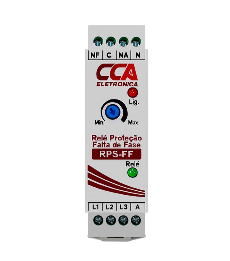 O Relé Falta de Fase CCA se trata de um relé eletrônico para proteção de sistemas trifásicos contra falta de fase (ou neutro) e assimetria de tensão. O grau de sensibilidade da assimetria é ajustável no knob frontal do relé. É aplicado em instalações visando a proteção de motores, equipamentos ou processos.